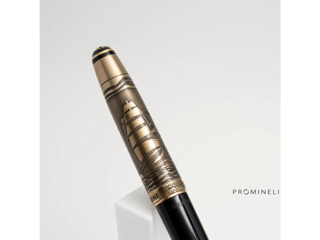 Tělo pera je vyrobeno z drahocenné černé pryskyřice, hluboké a lesklé jako vody rozbouřeného moře. Horní část těla pera, z pozlaceného kovu, dodává peru nádech lesku a připomíná sluneční světlo odrážející se od plachet lodi. Tento kontrast mezi hloubkou černé a nádherou zlata vytváří pozoruhodný vizuální efekt. Víčko, celé z pozlaceného kovu, je zdobeno rytinou profilu Amerigo Vespucciho, reprodukovanou s pečlivou přesností. Stylizované vlny obklopující víčko evokují pohyb moře, zatímco název kolekce, jemně vyrytý, dotváří design s nádechem elegance. Celek vytváří podmanivý předmět, který oslavuje krásu a sílu lodi.