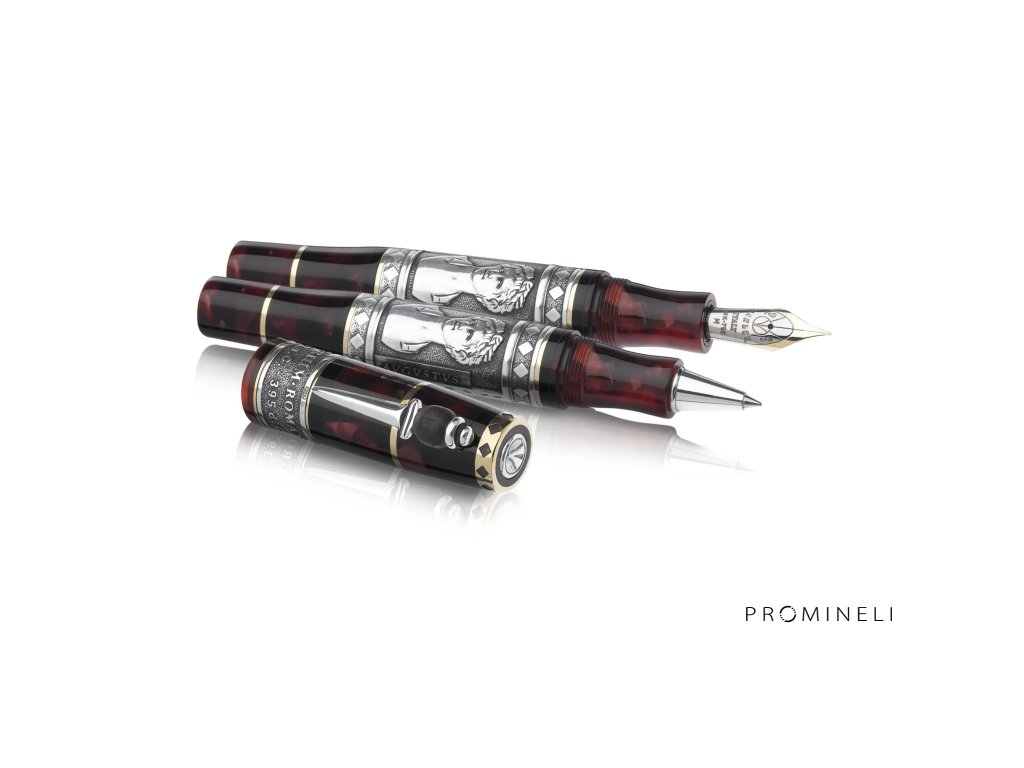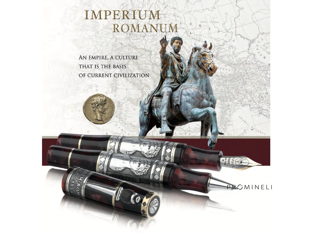 Kropenatá červená barva charakterizuje kolekci Imperium Romanum, vyrobenou z italské pryskyřice vyfrézované z masivního tyčového materiálu. Středový pás stříbrného těla reprodukuje podobiznu Augusta. Stříbrná spona má malý, ručně vyrobený dřevěný prvek. Kroužek na stříbrném víčku nese dvě data, která obecně označují začátek a konec jednoho státního celku: 27 př. n. l. - 395 n. l.