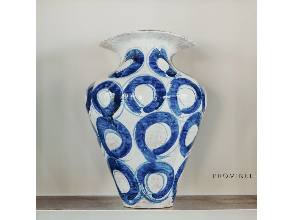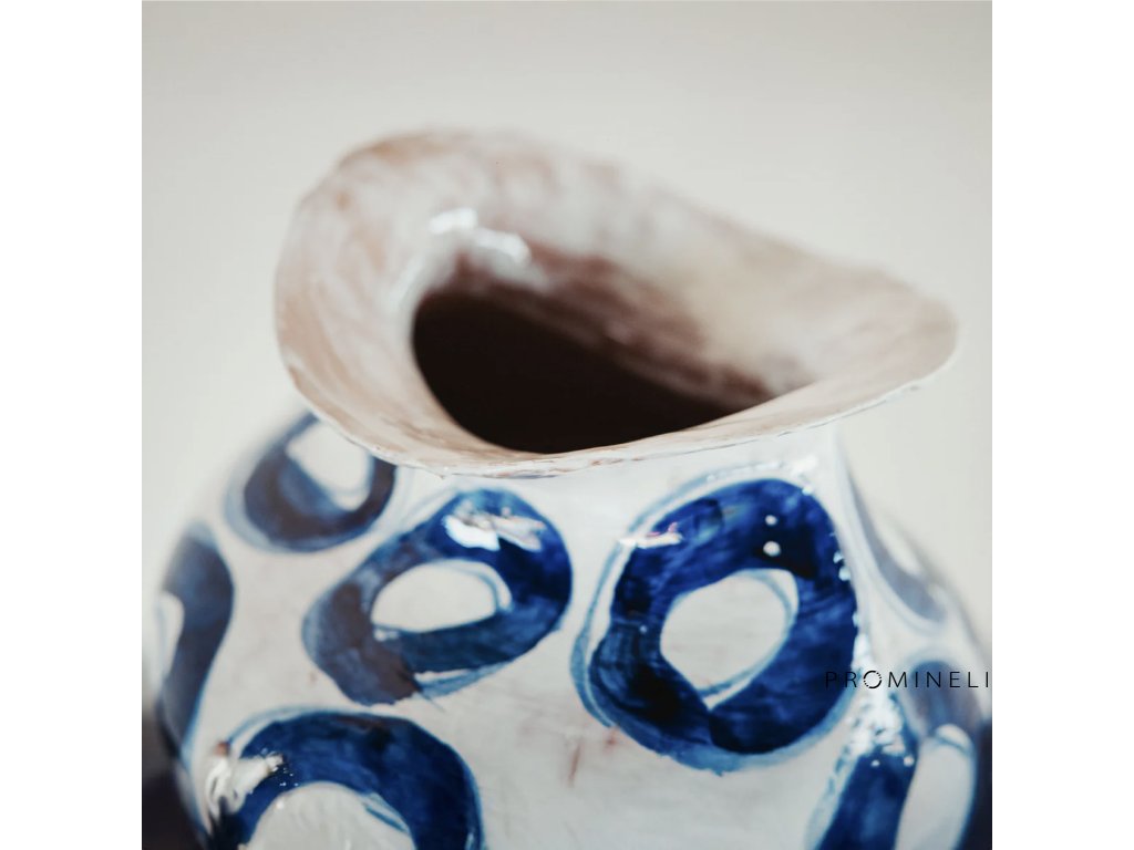 Dekor „Ecos“ představuje dozvuk moře, zvuk, který se opakuje jako dokonalý, neustále se rozpínající kruh. Tmavě modré prstence se vznášejí na povrchu vázy jako soustředné vlny, symboly kontinuity a neviditelného spojení. Každý prsten je malován volnou rukou, což je značka, která oslavuje věčnost pohybu a jedinečnost každého výtvoru. Žádné dva prsteny nejsou stejné, stejně jako žádné dvě vázy nejsou identické – každý kus nese neopakovatelný příběh svého zrodu.