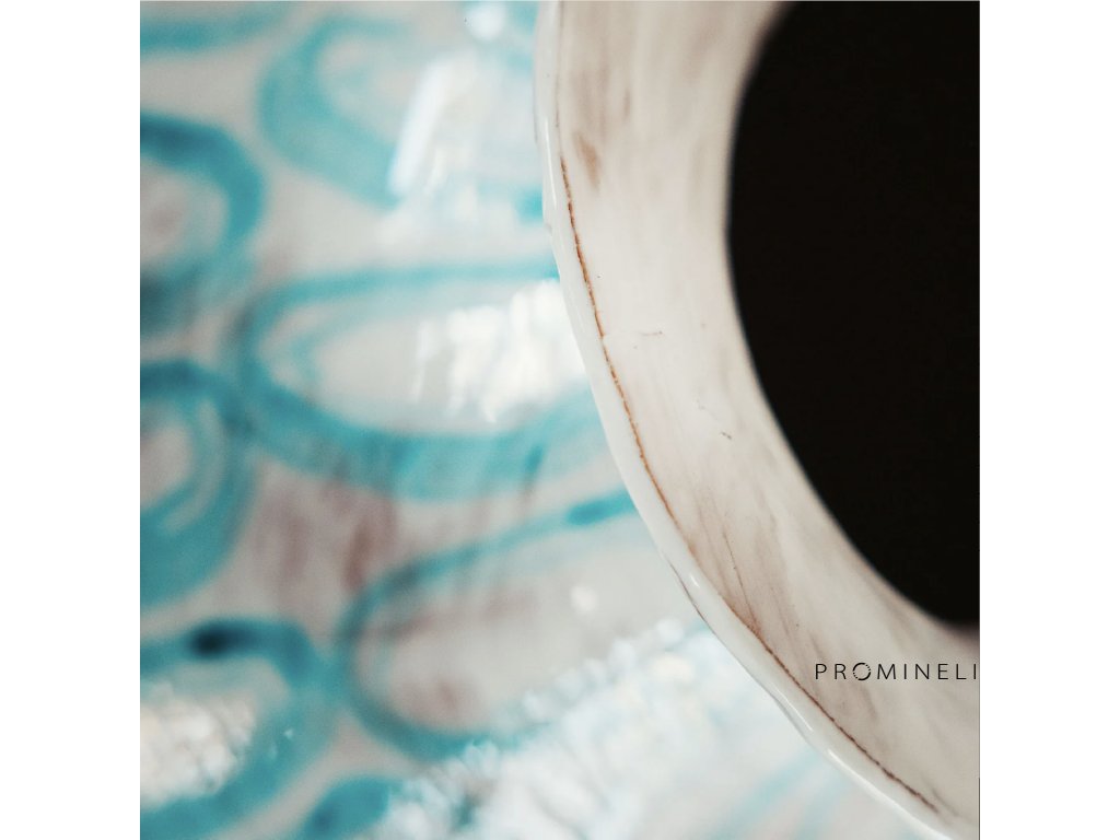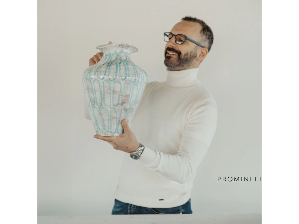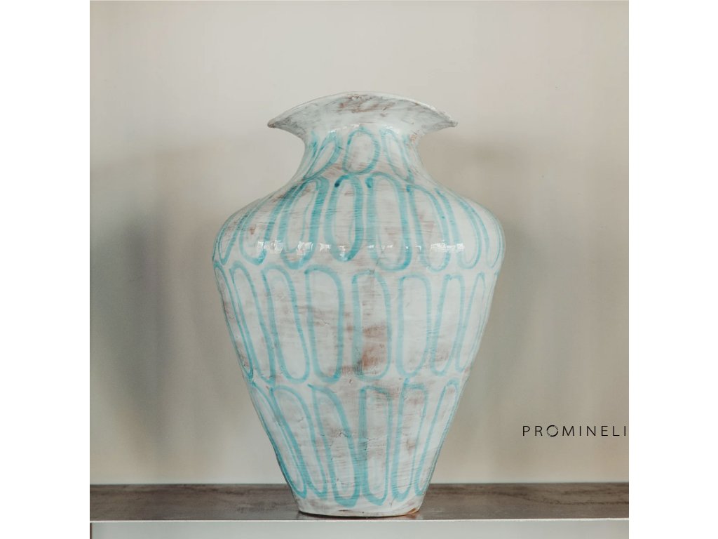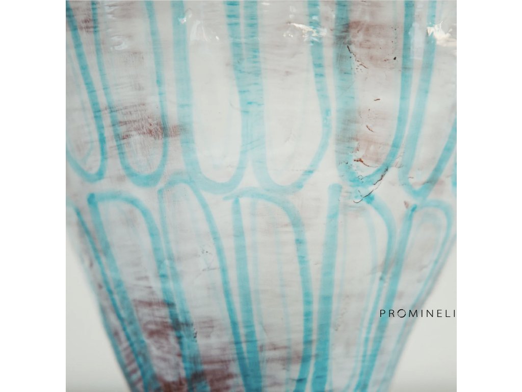 Dekor „Pluvia“ je poctou lehkosti dešťových kapek, které tiše padají a přinášejí svěžest. Vertikální azurové tahy štětcem stékají po povrchu jako dešťové kapky zastavené v čase. Tato dekorace nás vybízí k znovuobjevení krásy jednoduchosti a ticha, k okamžiku rozjímání, který v sobě ukrývá čistotu vody a dech nebes. Každá váza zdobená „Pluvií“ je vizuální báseň složená ze spontánních a jedinečných linií.
